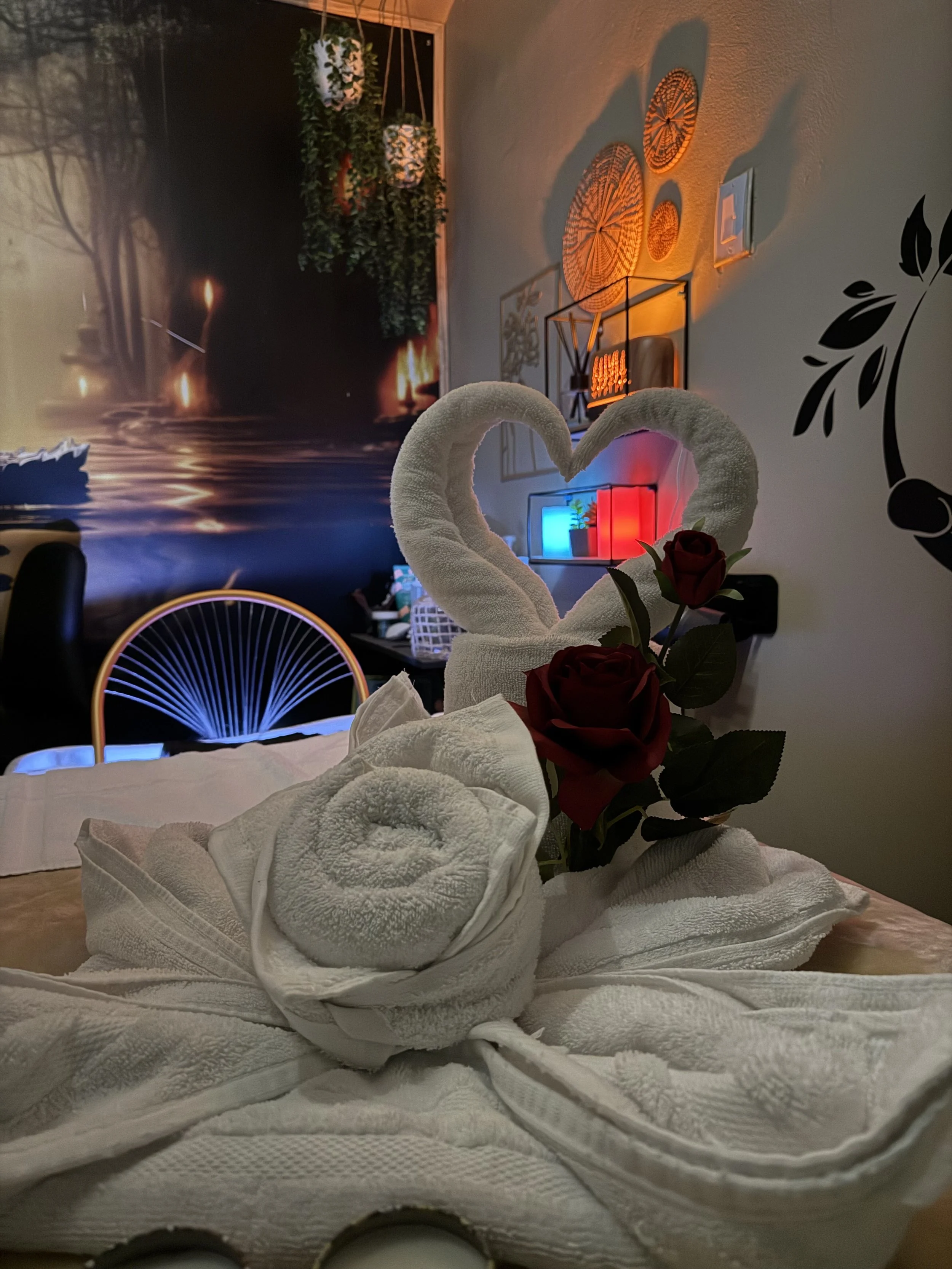 Balloons, rose petals, with a message & sweet treats!